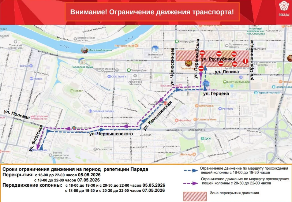 Департамент дорожной инфраструктуры и транспорта Тюмени информирует о временном прекращении движения в связи с репетициями парада, посвященного Дню Победы.